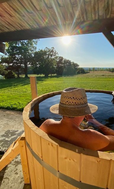 De gîte is een ruime 4-persoons woning met een mooie entree/leeskamer, een grote woonkamer met houtkachel, open keuken, twee slaapkamers met grote 2-persoons goede bedden, badkamer met inloopdouche en toilet en een enorm overdekt terras met een grote houten cold tub, bbq, tuinmeubelen, hangmat, buitendouche en buiten wc.